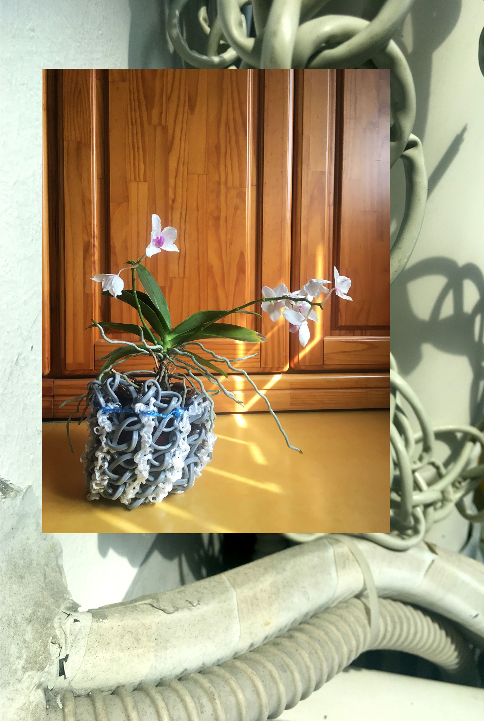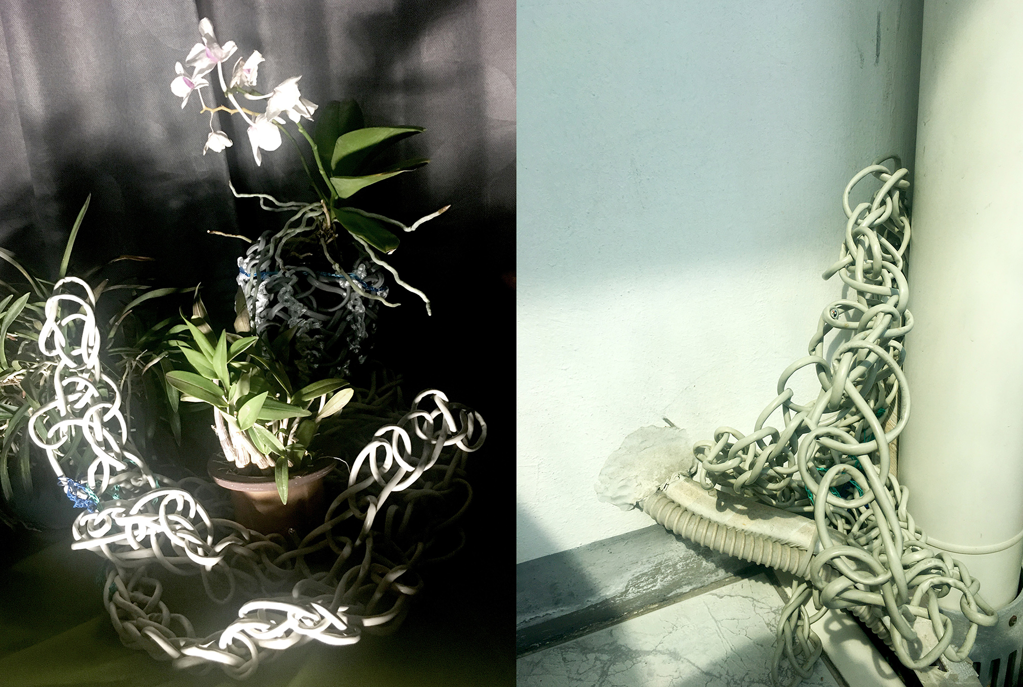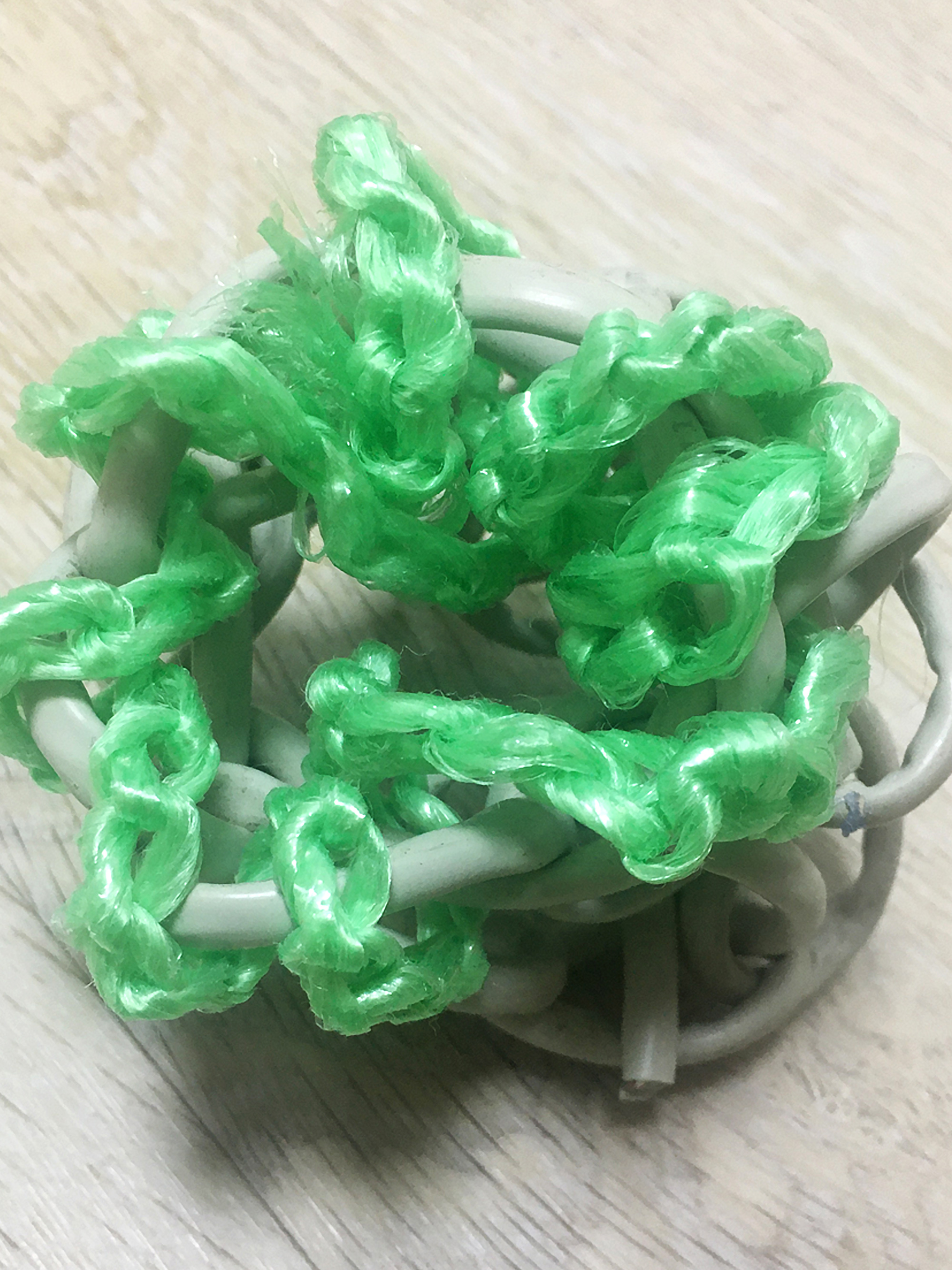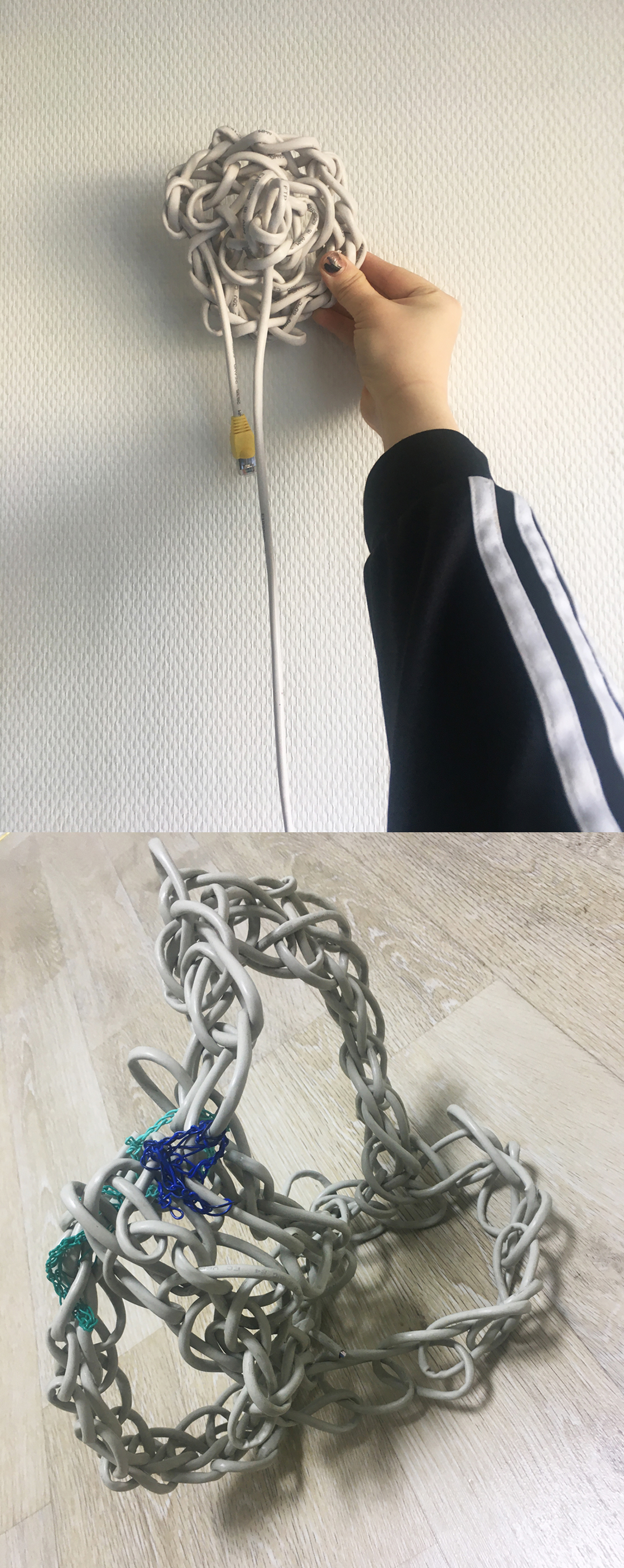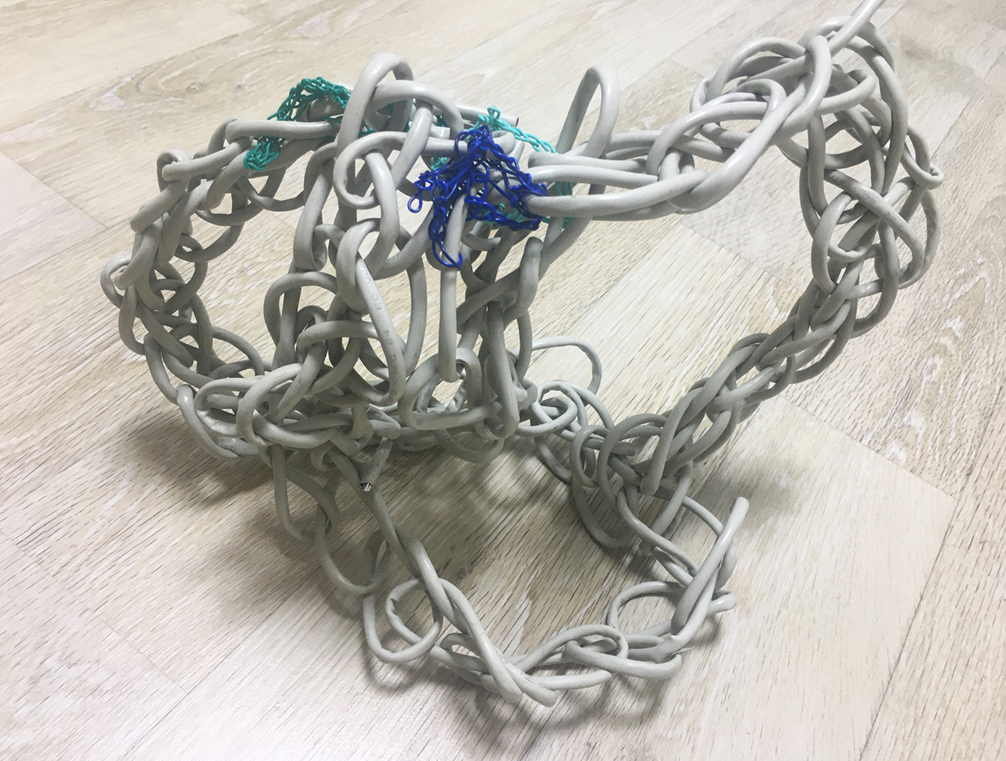 All kinds of relationships, between human beings or between animals or plants, entail entanglement. Sometimes these take on a parasitic shape, seemingly unbalanced but beautiful. Both parties need to be there to establish the bond. Forming 3D shapes out of different types of cables with a crochet technique. Each sample can stand on its own yet also asks to belong to the something or someone else.