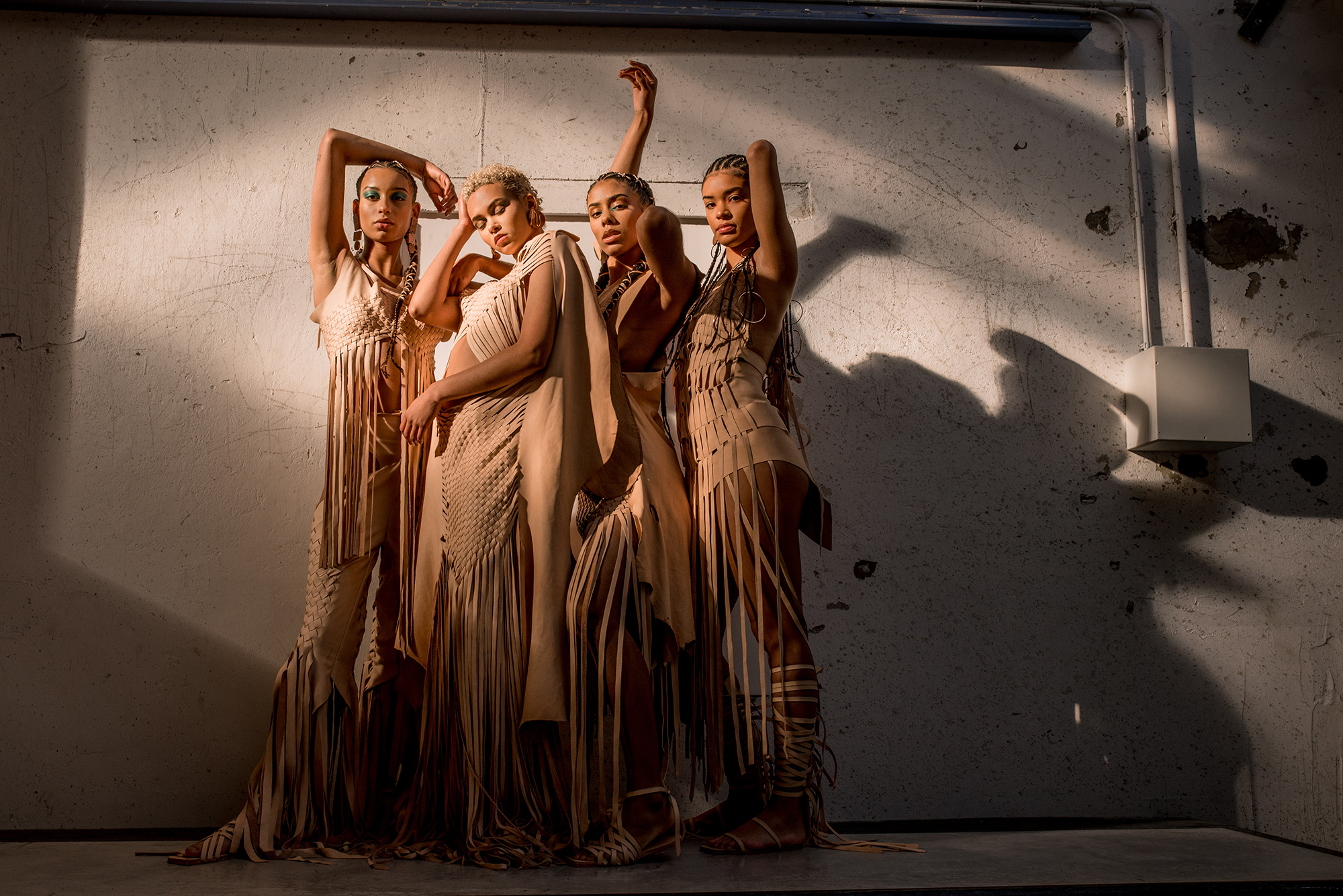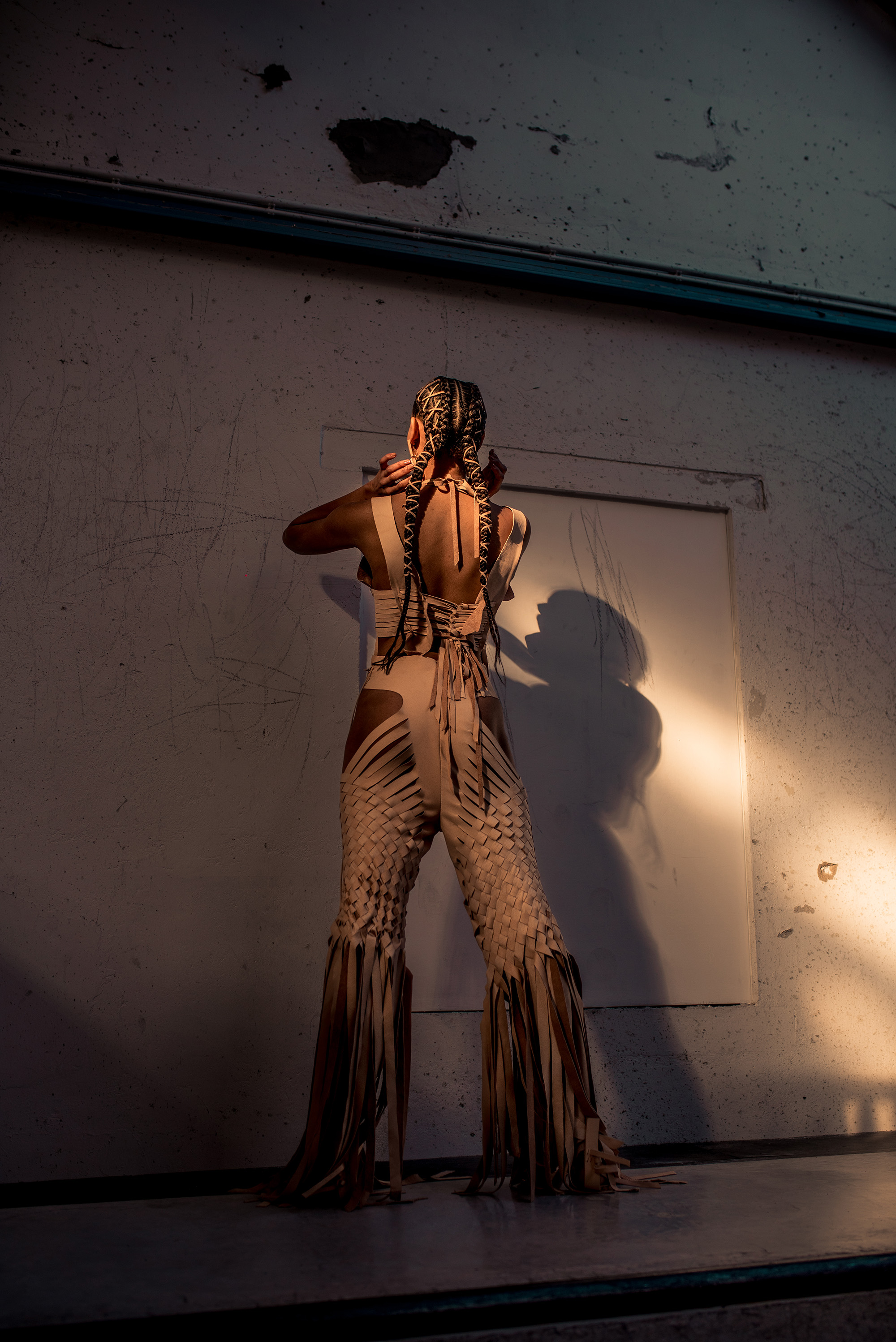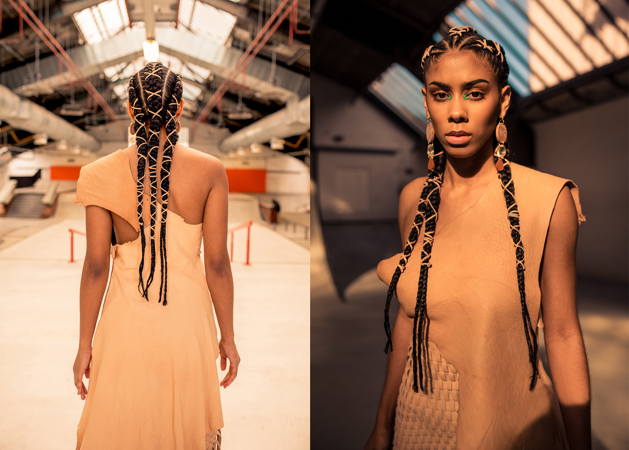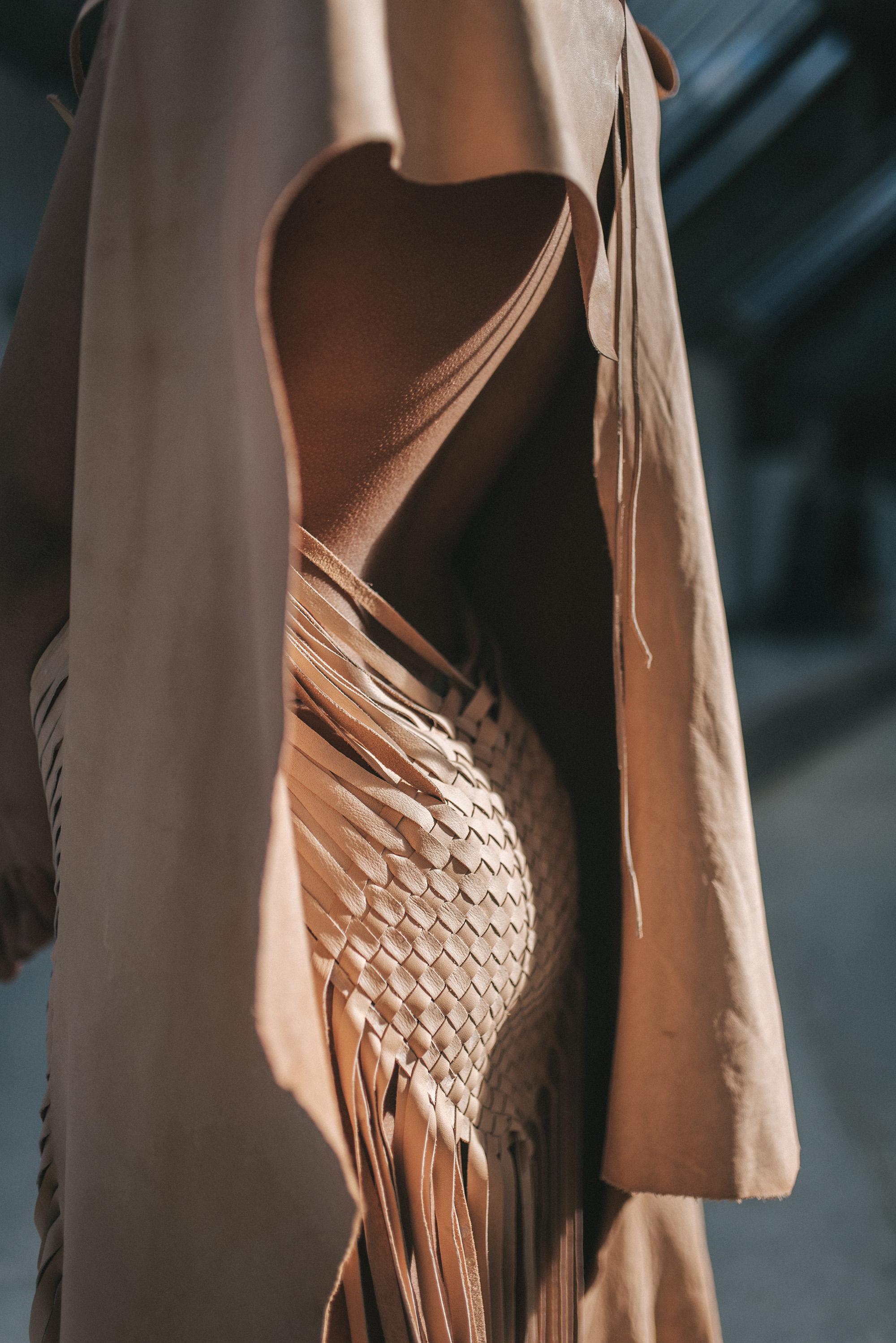 Petra started her research into America's First Nations Blackfeet tribe and was inspired by James, a Siksika boy who lives in the Blackfeet reservation. He encouraged her to make the collection entirely out of leather, the material his ancestors used to craft their clothes with, always using the entire skin of the animal. She took the original shape of the skin as a starting point, then weaving the leather as a construction for the shapes, but more important as a crucial symbol for strength in unity. This symbol is again reflected in the black model’s braided hairstyles.