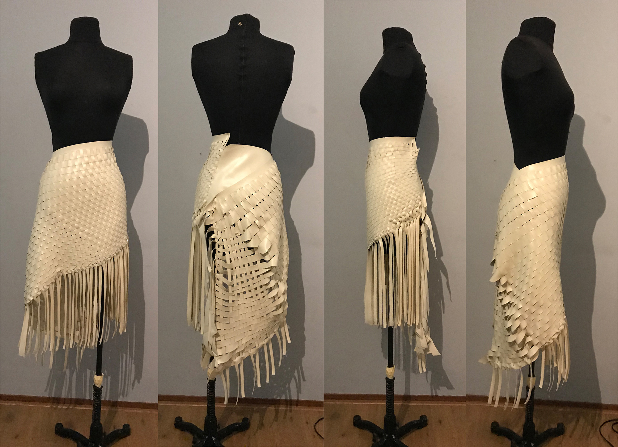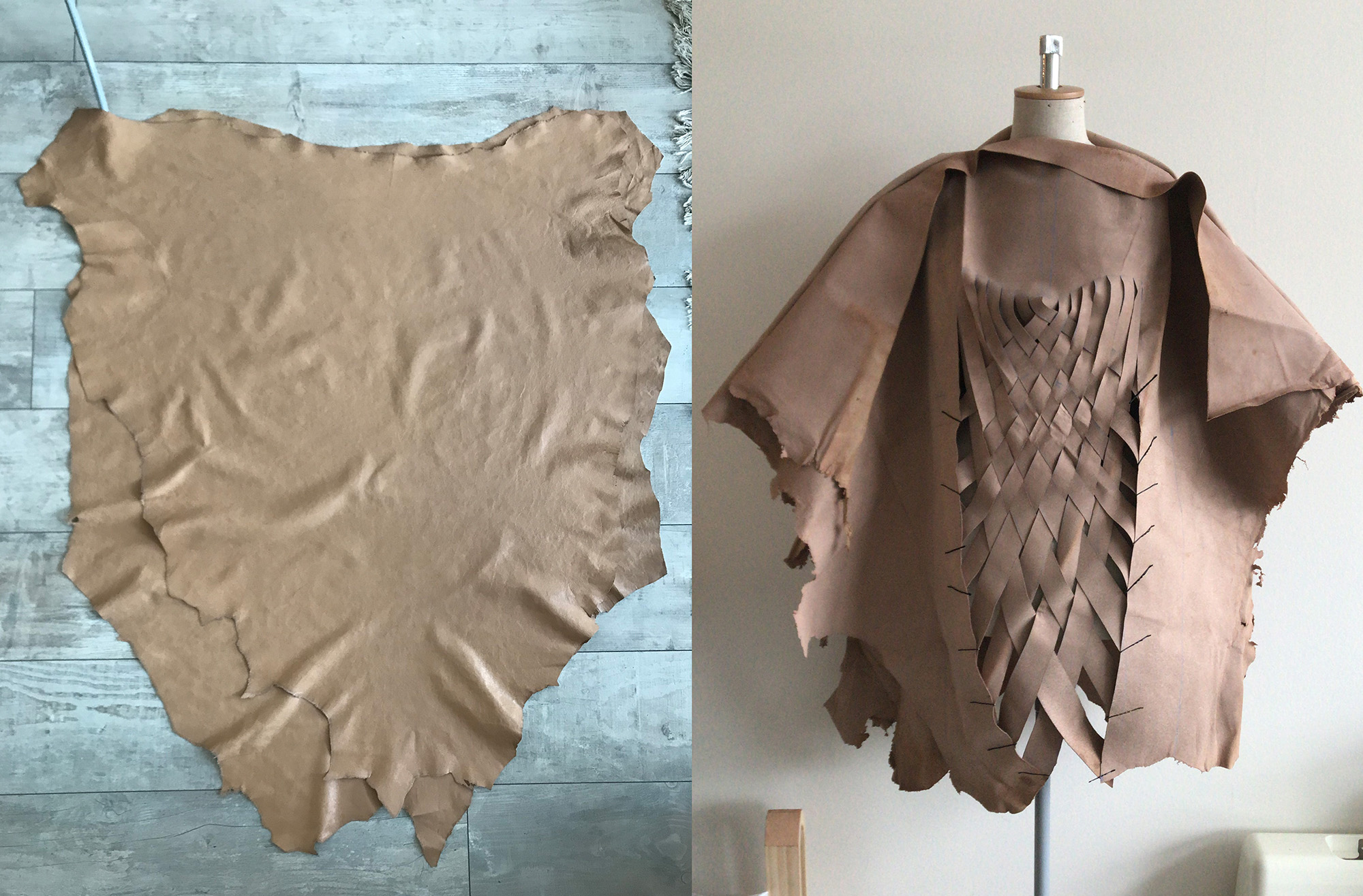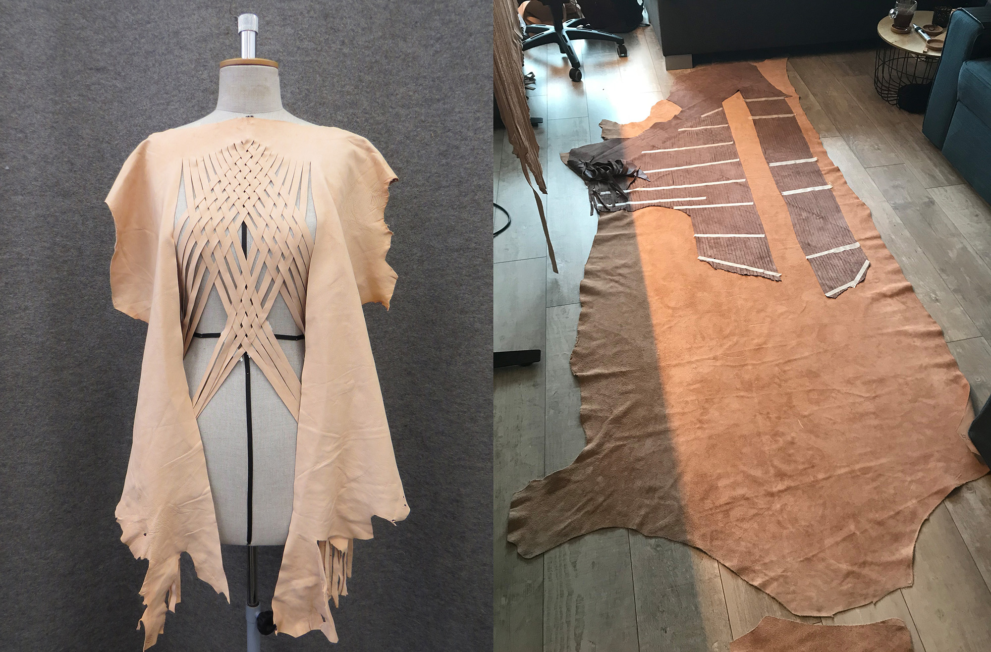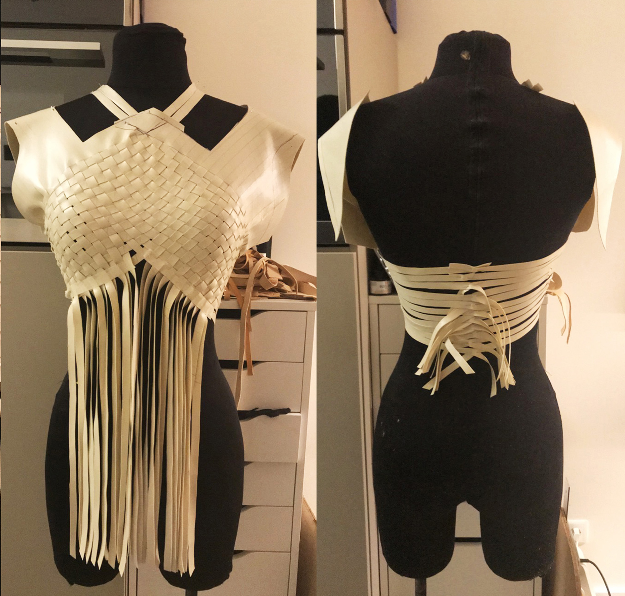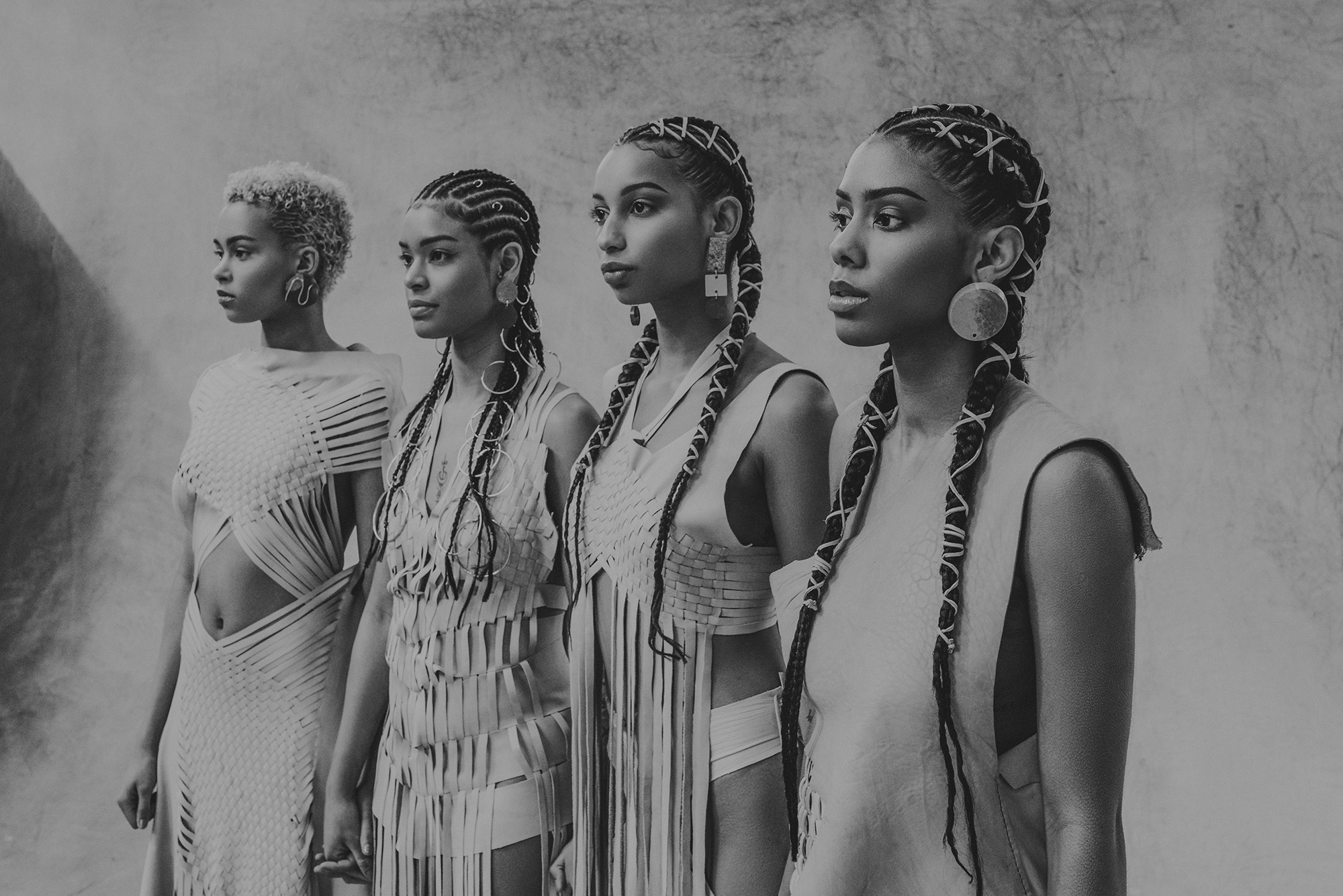 Petra started her research into America's First Nations Blackfeet tribe and was inspired by James, a Siksika boy who lives in the Blackfeet reservation. He encouraged her to make the collection entirely out of leather, the material his ancestors used to craft their clothes with, always using the entire skin of the animal. She took the original shape of the skin as a starting point, then weaving the leather as a construction for the shapes, but more important as a crucial symbol for strength in unity. This symbol is again reflected in the black model’s braided hairstyles.