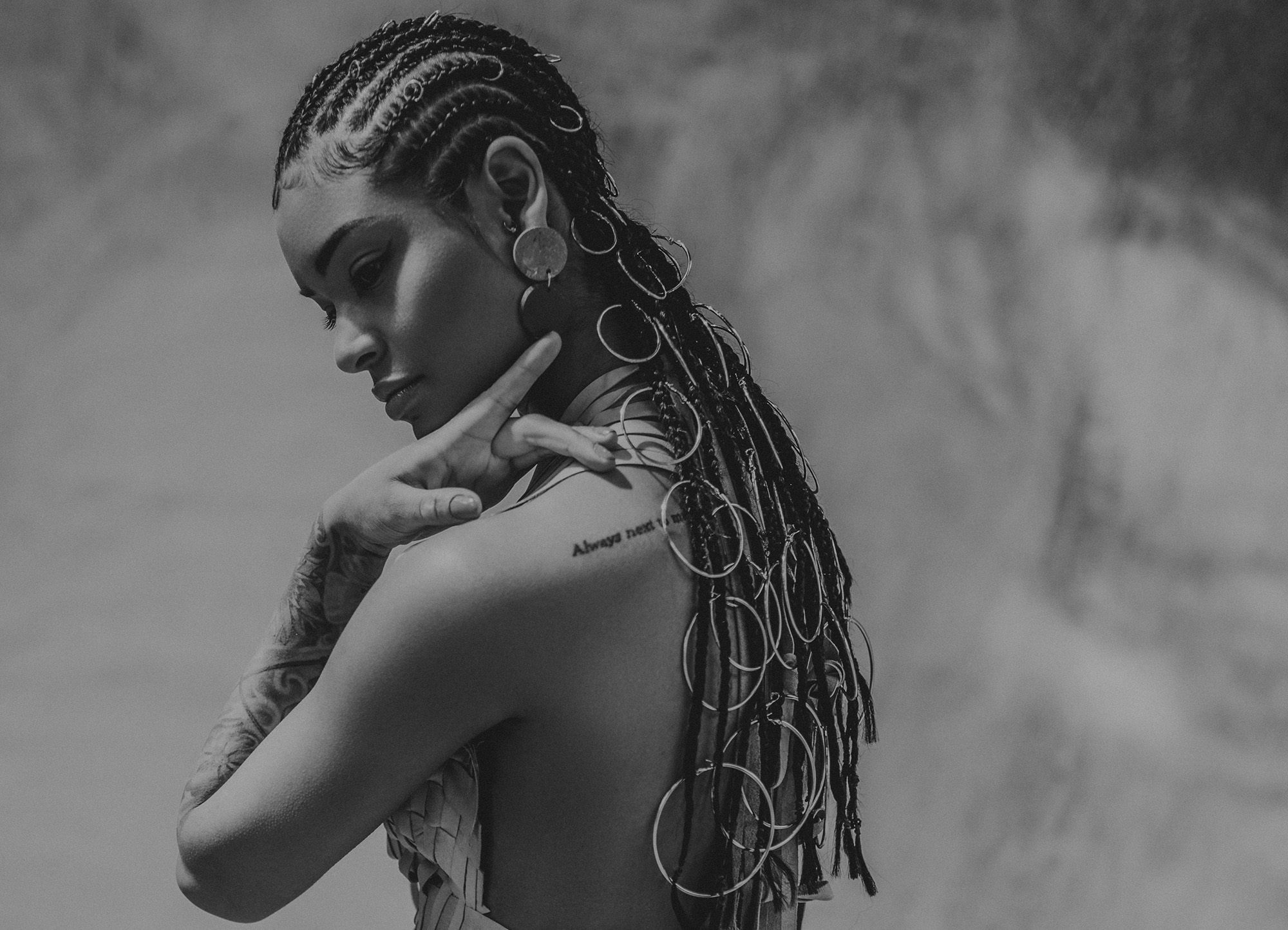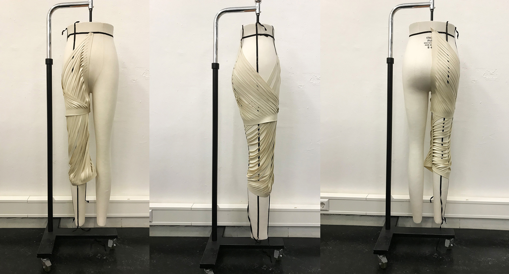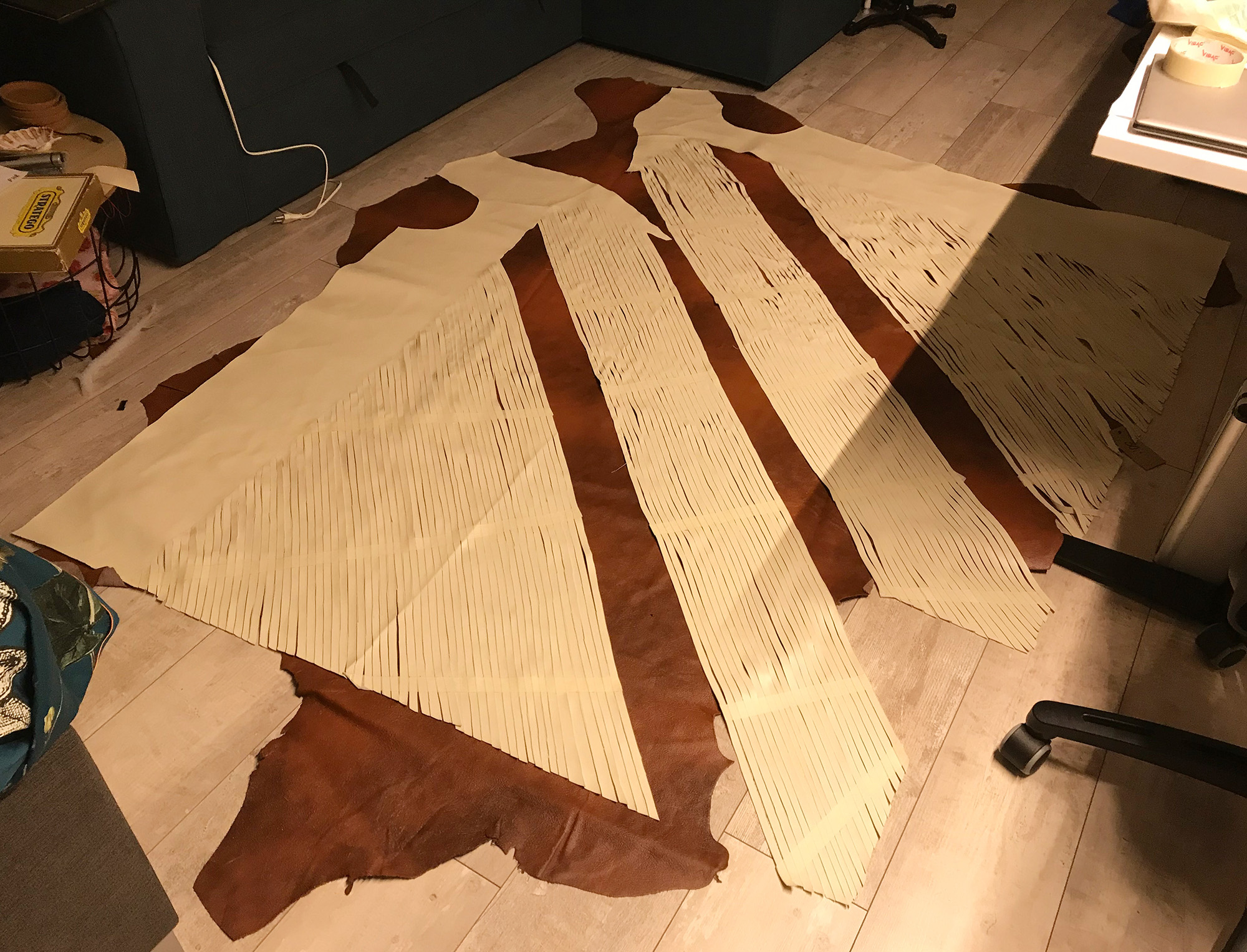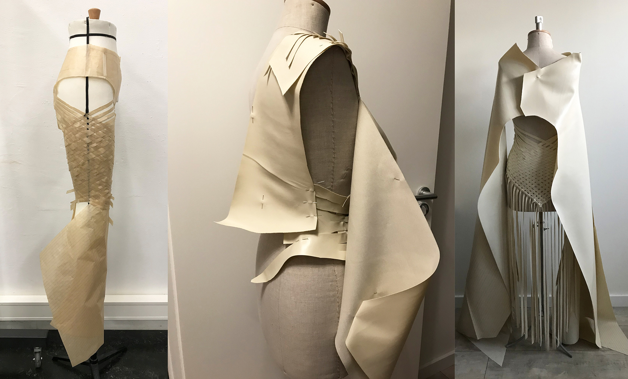 Petra started her research into America's First Nations Blackfeet tribe and was inspired by James, a Siksika boy who lives in the Blackfeet reservation. He encouraged her to make the collection entirely out of leather, the material his ancestors used to craft their clothes with, always using the entire skin of the animal. She took the original shape of the skin as a starting point, then weaving the leather as a construction for the shapes, but more important as a crucial symbol for strength in unity. This symbol is again reflected in the black model’s braided hairstyles.
